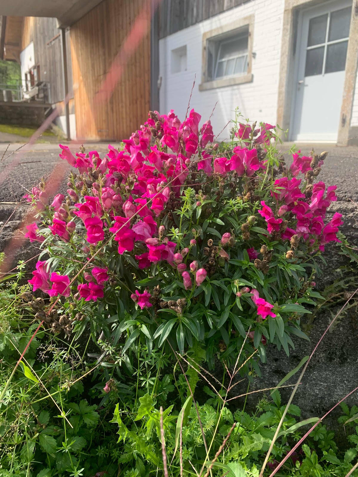 A random cluster of thriving snapdragons by the barn. Nobody put them there. But snapdragons do quite well here, and become perennials, if they get water.