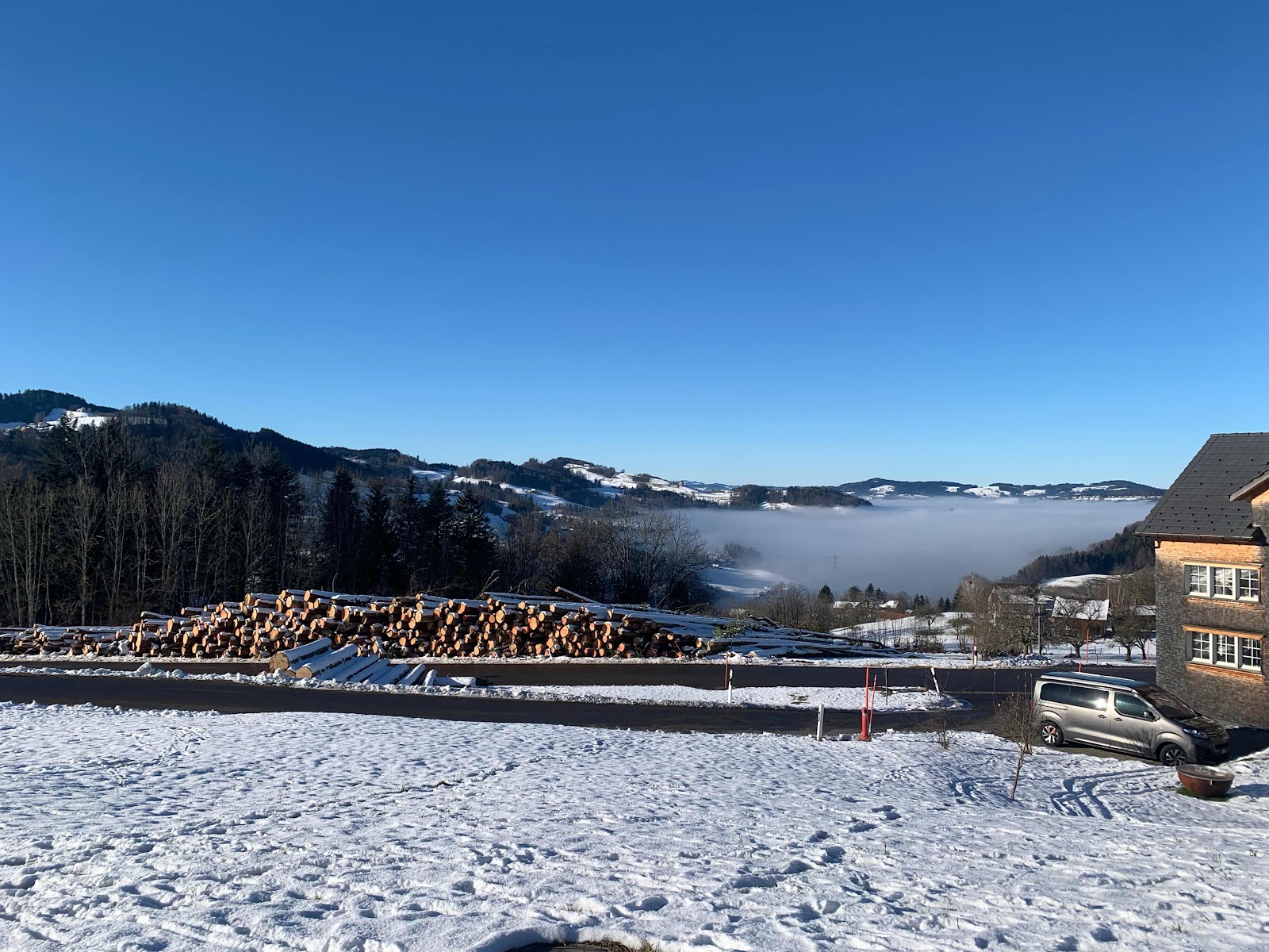 Looking toward the Säntis. The log piles are the products of the days of helicopter work we watched.