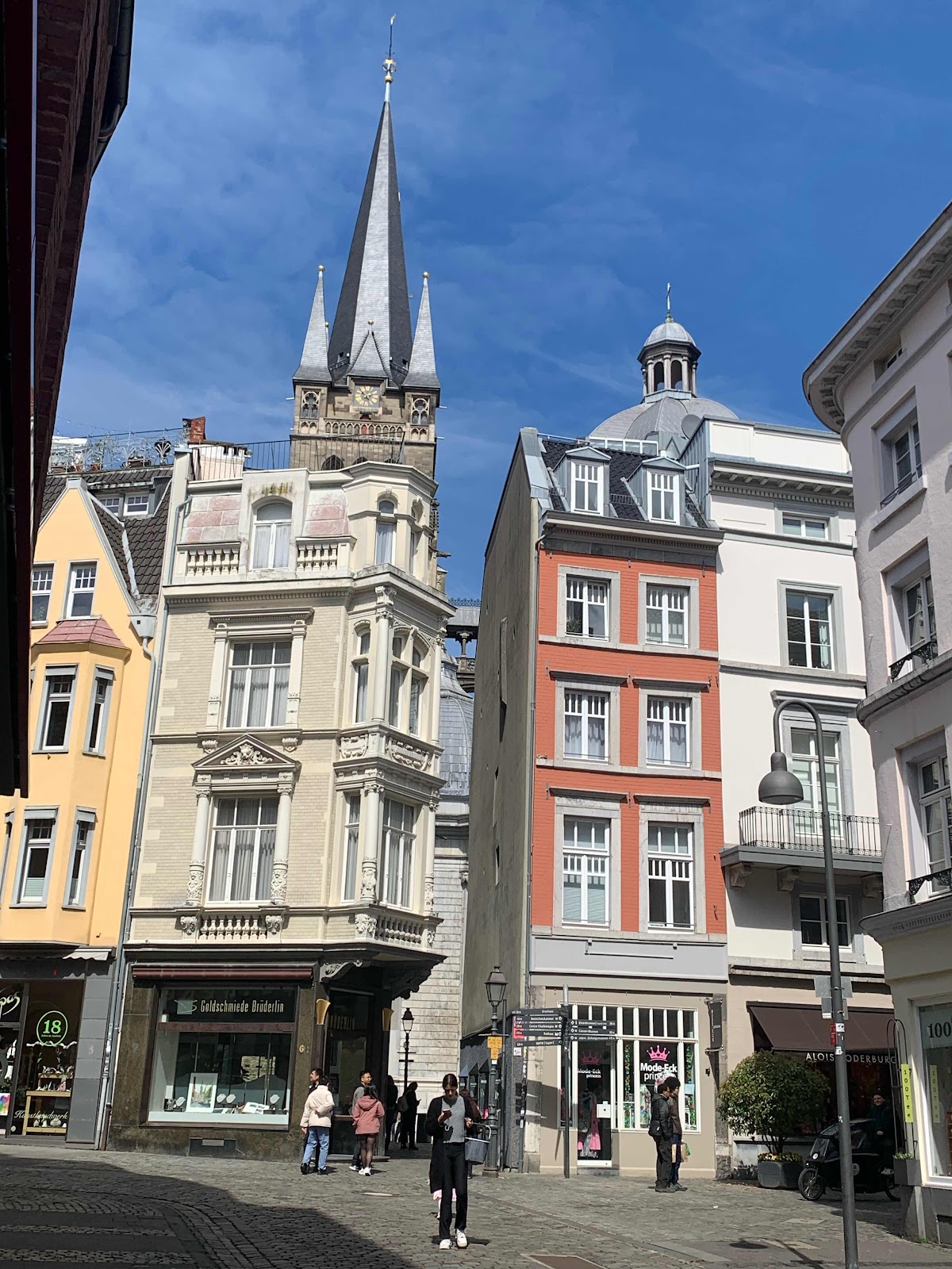 Aachen (from old German, Aach = River, from old High German, ahha = water, stream, related to Latin, aquarium = springs) was the site of the first urban battle in WWII, in which the majority of the city was totally destroyed. Except the ancient Cathedral. Though it was heavily damaged by air raids, its structure survived. The city seen today was reconstructed after the war.