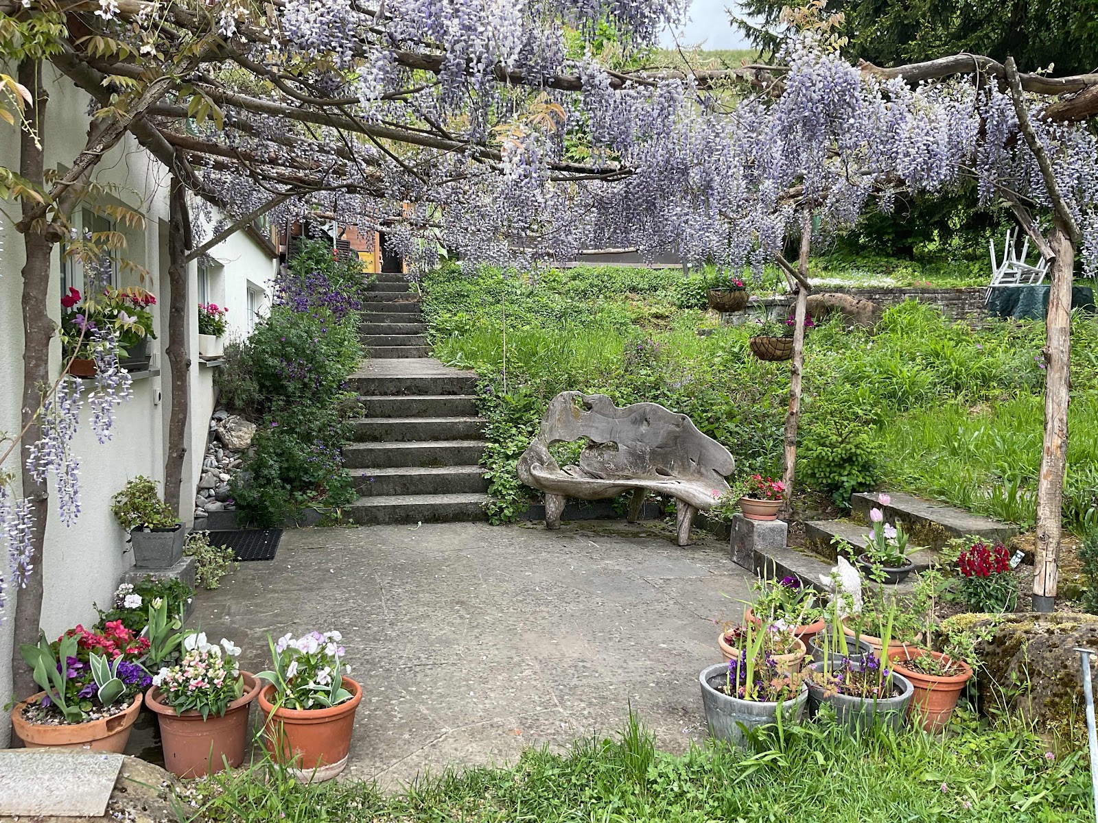 We had another afternoon in the garden (here that means all the area around the house). I potted more flowers, we swept up bushels of wisteria petals, and by the end, some seeds were planted, some grassed mown, lots of weeds pulled, and the rain held off.