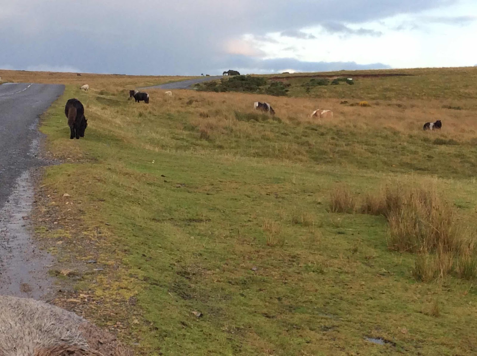 On the way to wide open moors we drive through forested countryside. Hedges, ivy covered walls, no shoulders, curves you can’t see around, one-lane stone bridges, passing vehicles that don’t slow down or move over on those tiny roads. That was the drive to Princeton in the National Park of Dartmoor. But we also saw sheep, lots of free-roaming sheep. And ponies, herds of free roaming ponies. They have been there since about 2000 BC. The Romans used them for chariot horses. The native breed is solid colored, but much outside blood has been introduced over the centuries, so pinto, and Shetland-sized ponies, and touches of Arab blood are evident.