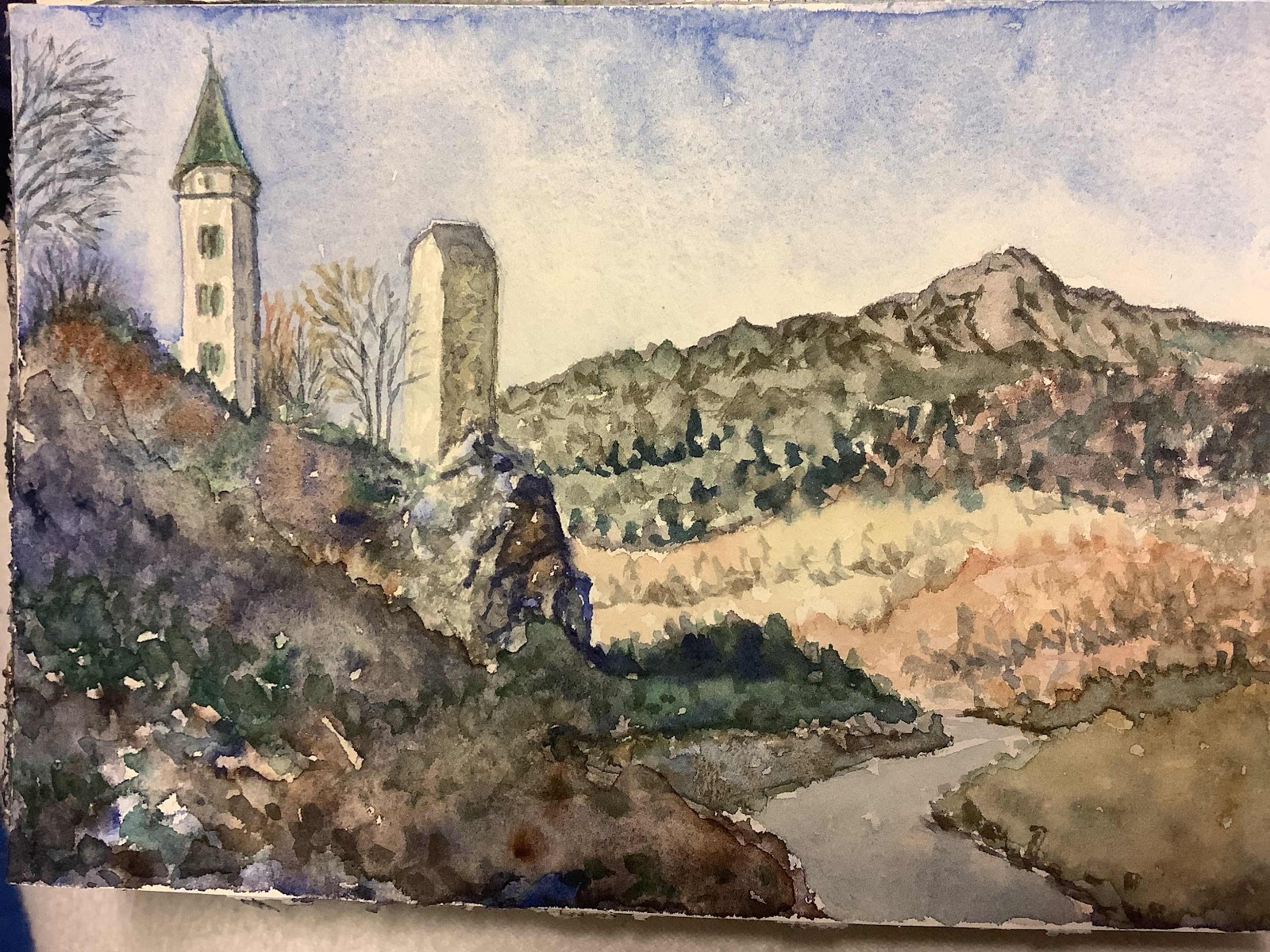 I am back from a week away in the mountains. It wasn’t a vacation, and now I am doing a six day get-this-stuff-down-your throat cleanse, preparatory to even better stuff. But while we were away we had some free time, so I did a few watercolors from our daily hikes. There was no WiFi there, I had no iPad, so the trusty old camera was put to use again. I plan to share pictures, because it was a very scenic area. Here is a view of what one sees arriving up the mountain on the switchback roads, across high bridges spanning very deep gorges between very high mountains.