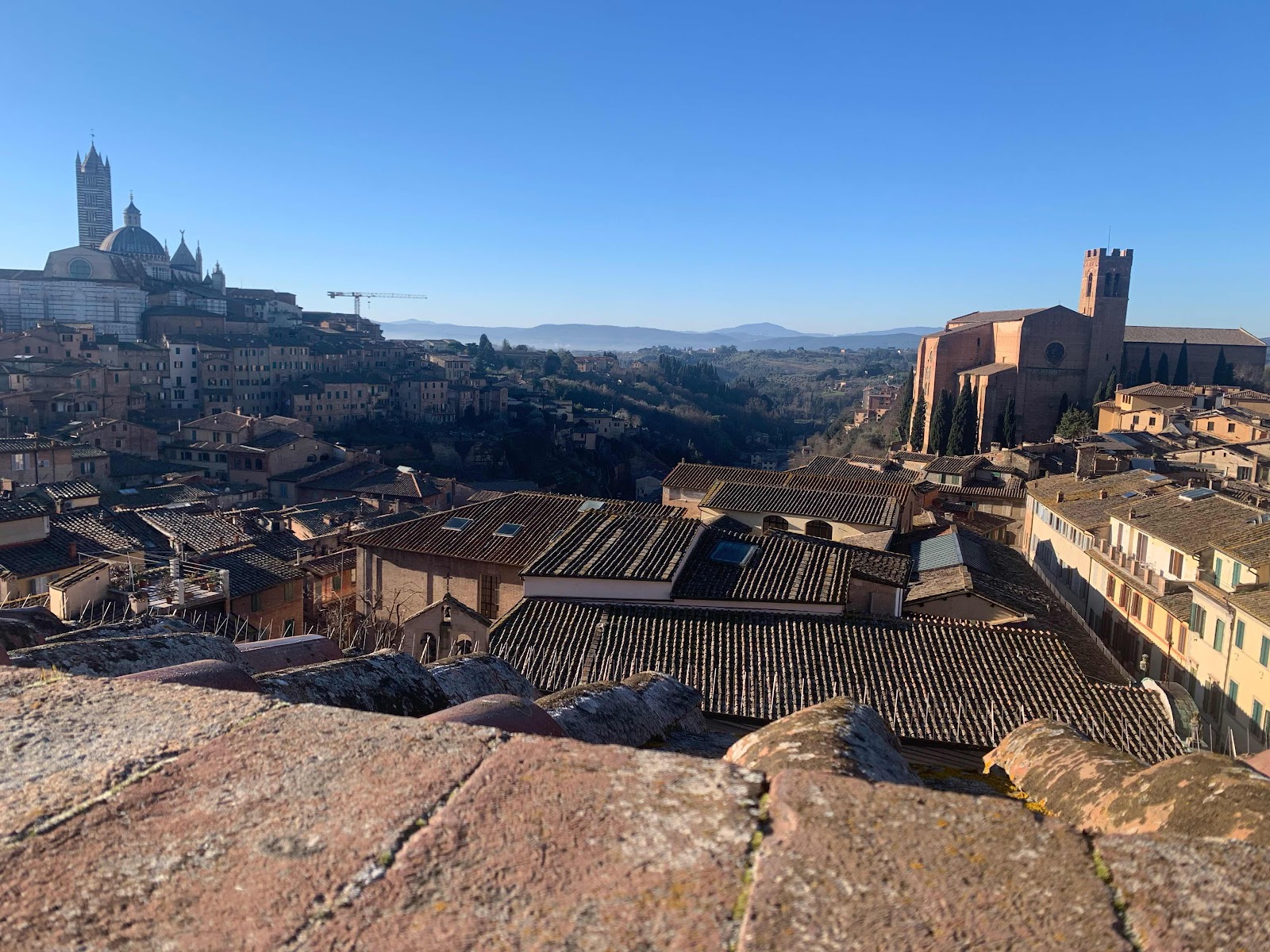 On a brilliant morning, on our first full day in Siena, we had this view from our balcony. We subsequently went to both churches. The Duomo is on the left.