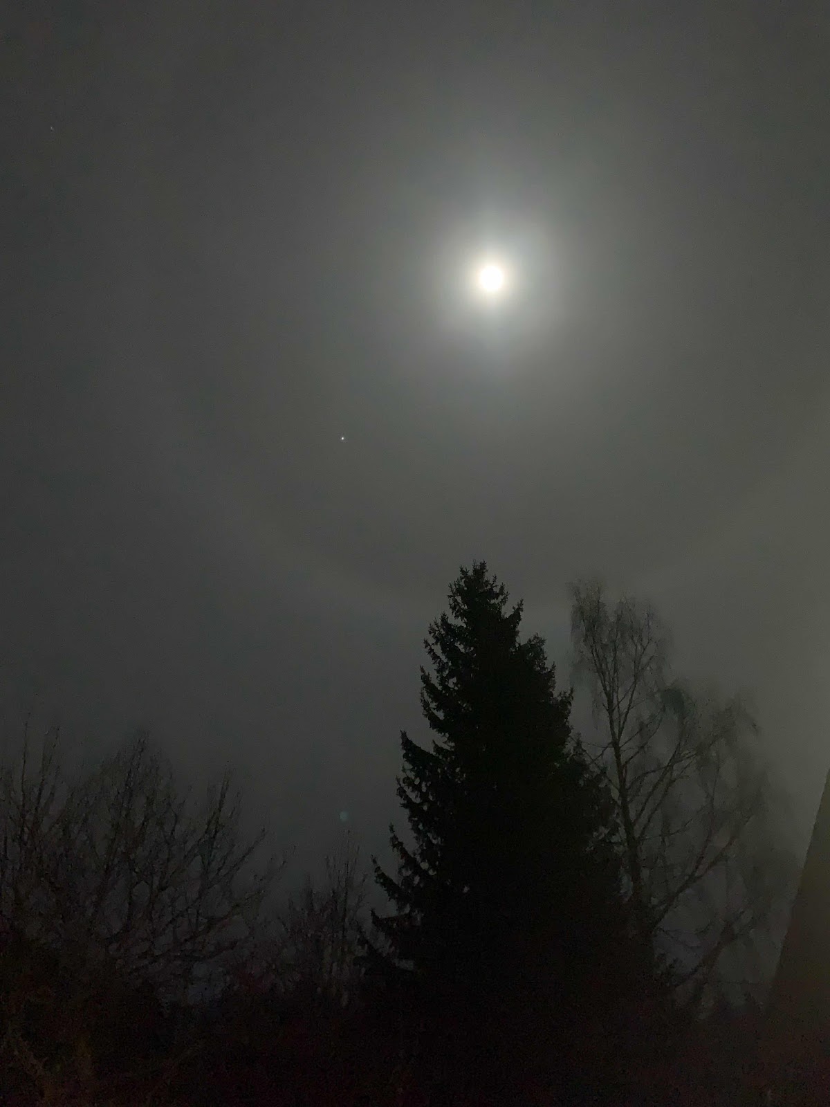 A perfect halo surrounded the moon tonight. If you look closely you can see the circle some distance from the glow of the moon going just behind the tops of the trees.
